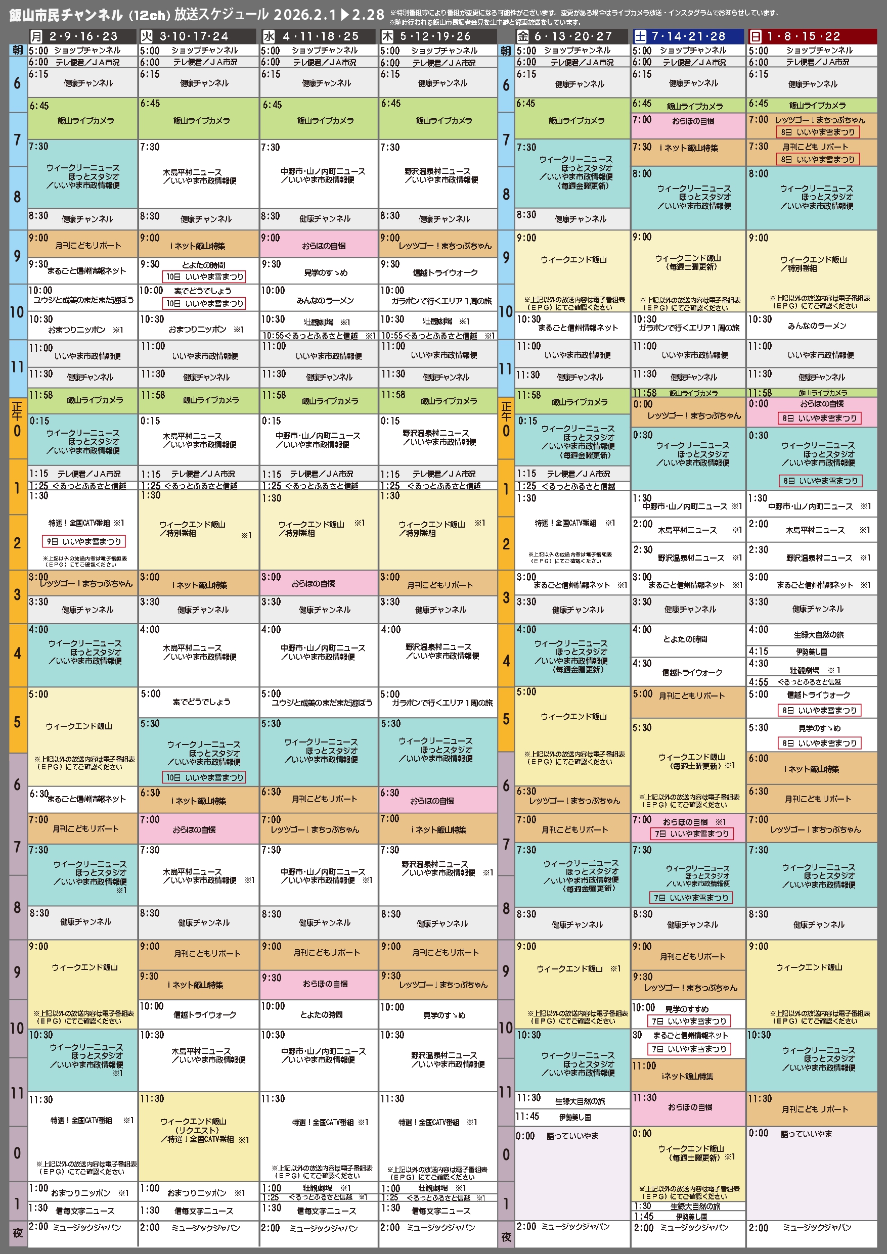 2024.03.26 appealareaslide003top02top03 テレビTelevisionインターネットInternet市民チャンネルChannel工事についてConstructionモコミュMocommu お知らせ 市民チャンネルの番組紹介 2026.01.05 新年のご挨拶 2026.01.05 年末年始休業のお知らせ 2025.12.10 BS10スターチャンネルのチャンネル名称変更について 2025.10.17 特別番組 奈良澤大天狗(奈良澤神社例大祭)放送のお知らせ 2025.09.22 障害・メンテナンス 伝送路設備メンテナンスによる停波のお知らせ 2025.11.122025.11.19 伝送路設備工事による停波のお知らせ 2025.10.092025.10.20 伝送路設備工事による停波のお知らせ 2025.09.22 CSデジタル放送休止のお知らせ 2025.08.28 伝送路設備メンテナンスによる停波のお知らせ 2025.06.25 12ch番組表 2025年12月見出しレイヤー2025年年末年始特番2026年2月 2025年12月2025年年末年始特番2026年2月 コンテンツ 〒389-2253 長野県飯山市大字飯山1095-1 :0269-81-3000 :0269-81-3001