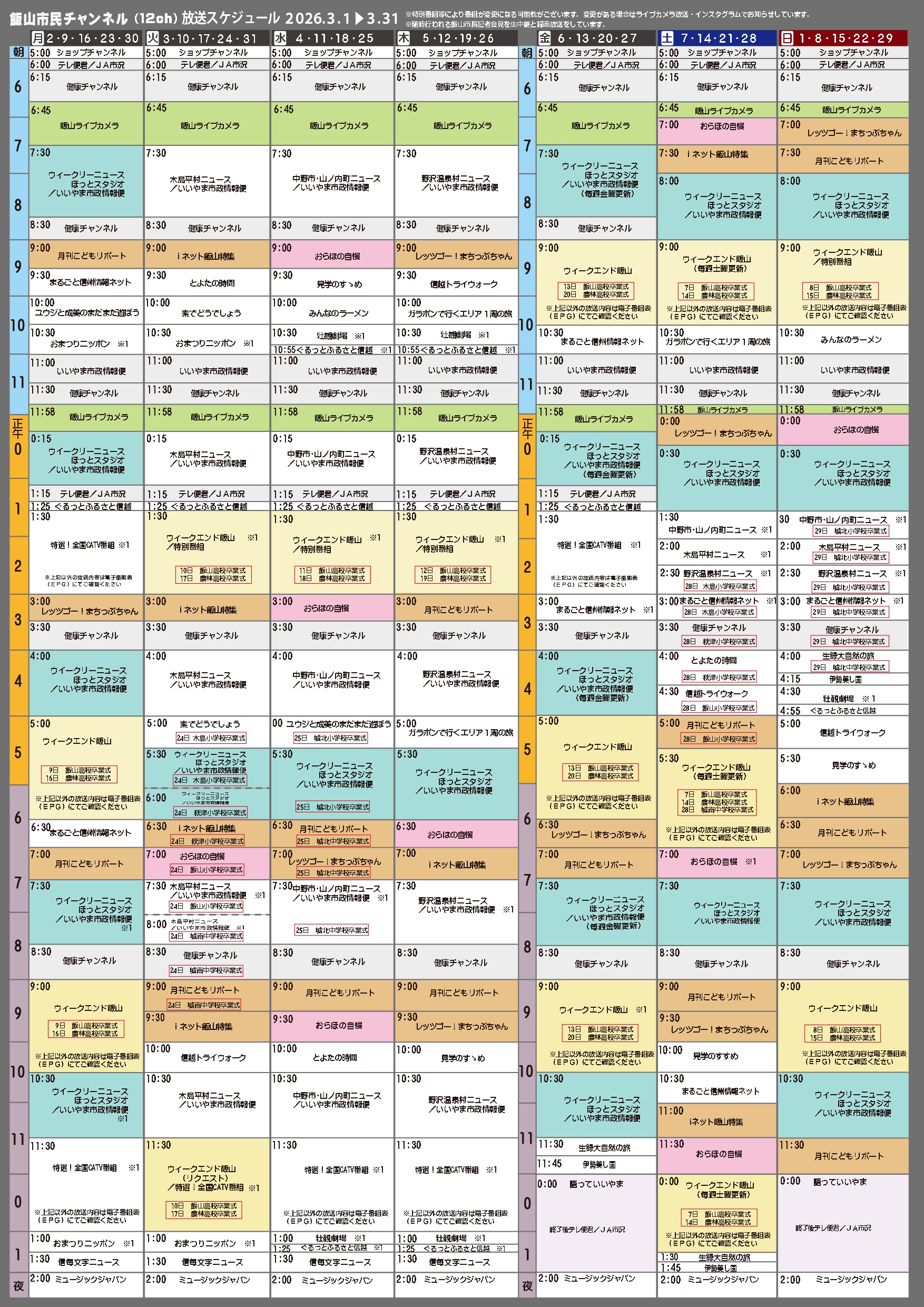 2024.03.26 appealareaslide003top02top03 テレビTelevisionインターネットInternet市民チャンネルChannel工事についてConstructionモコミュMocommu お知らせ 市民チャンネルの番組紹介 2026.01.05 新年のご挨拶 2026.01.05 年末年始休業のお知らせ 2025.12.10 BS10スターチャンネルのチャンネル名称変更について 2025.10.17 特別番組 奈良澤大天狗(奈良澤神社例大祭)放送のお知らせ 2025.09.22 障害・メンテナンス CSデジタル放送休止のお知らせ 2026.01.16 伝送路設備メンテナンスによる停波のお知らせ 2025.11.122025.11.19 伝送路設備工事による停波のお知らせ 2025.10.092025.10.20 伝送路設備工事による停波のお知らせ 2025.09.22 伝送路設備メンテナンスによる停波のお知らせ 2025.06.25 12ch番組表 2026年3月見出しレイヤー2025年年末年始特番2026年2月 2026年3月2025年年末年始特番2026年2月 コンテンツ 〒389-2253 長野県飯山市大字飯山1095-1 :0269-81-3000 :0269-81-3001